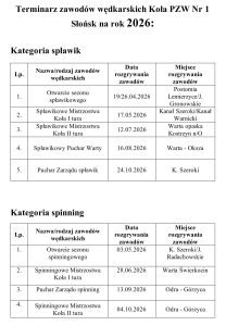 Przedstawiamy terminarz zawodów wędkarskich na sezon 2026. Z przyczyn losowych terminy i miejsca mogą ulec zmianie. Szczegółowe informacje w komunikatach przed każdymi zawodami. Zachęcamy do aktywnego uczestnictwa.